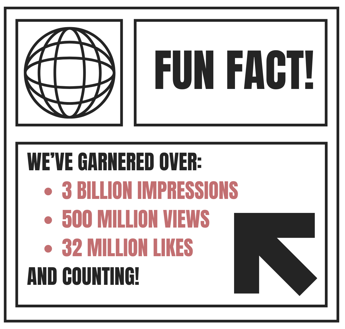 Fun Fact! Original content that we’ve produced has amounted to over 70,000,000 views & our commissioned content has garnered an astonishing 3 BILLION impressions & 500 MILLION views.